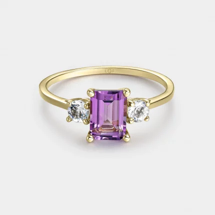 Anillo trilogía amatista octogonal 7*5 y amatistas verde 3mm con circonitas en oro de 18 quilates.