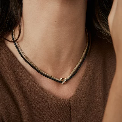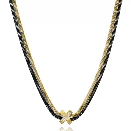 Collar de mujer de acero Ip dorado y negro doble esterilla redonda con una X con circonitas