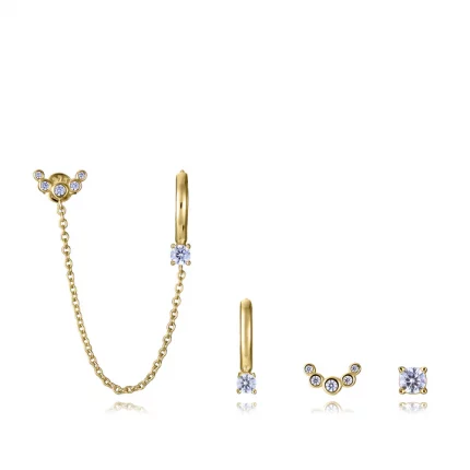 Pendientes de plata de primera ley con baño de oro, 4 piezas con circonitas blancas, par de aros y a presión.