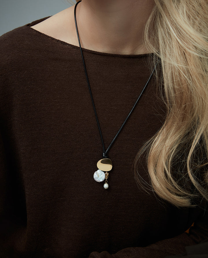 Collar de mujer de acero Ip dorado y cordón negro con perlas naturales