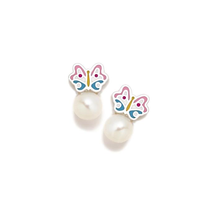 Pendientes de plata de ley y baño de rodio, con esmalte, perla y cierre de rosca.