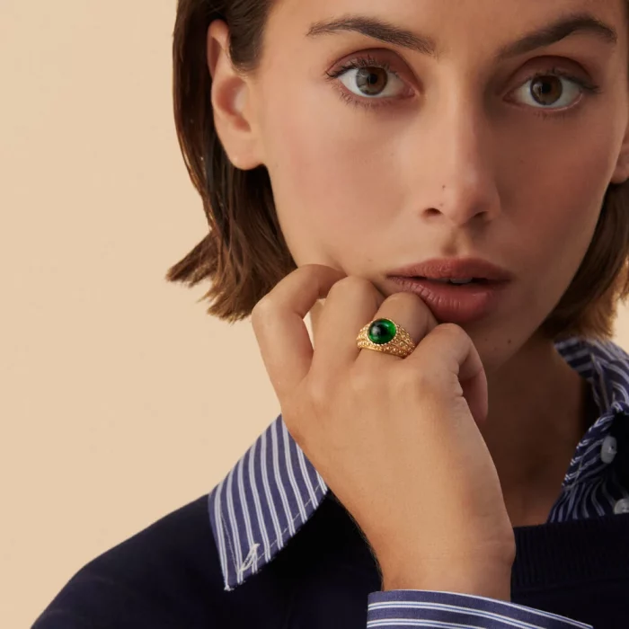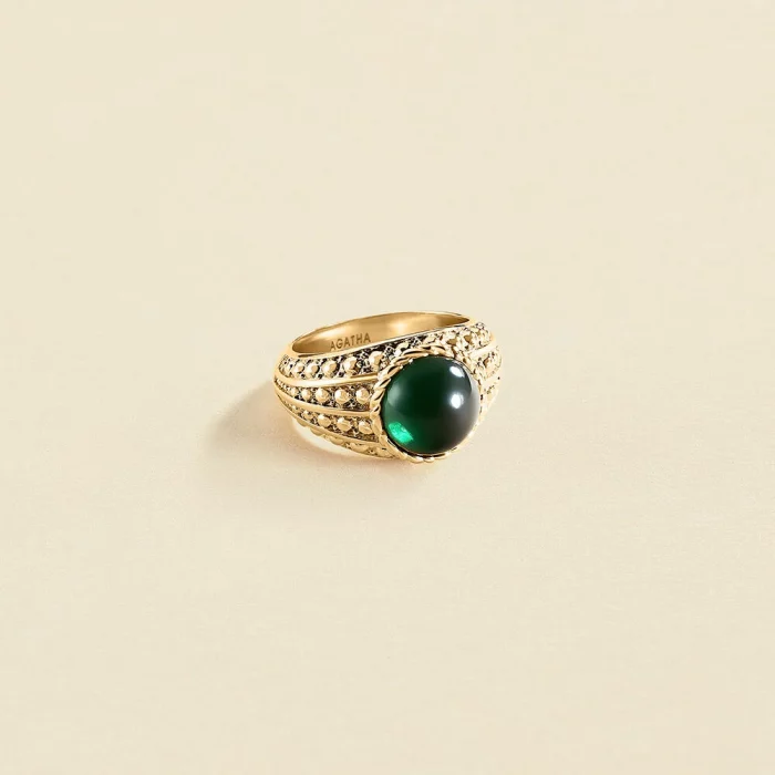 Anillo ancho acabado en oro con cabujón de color verde esmeralda. Los anillos con piedras grandes están de moda y este ha venido para quedarse. La colección nº13 de María Pombo está inspirada en las joyas vintage más icónicas de Agatha Paris y no puedes quedarte sin ellas.