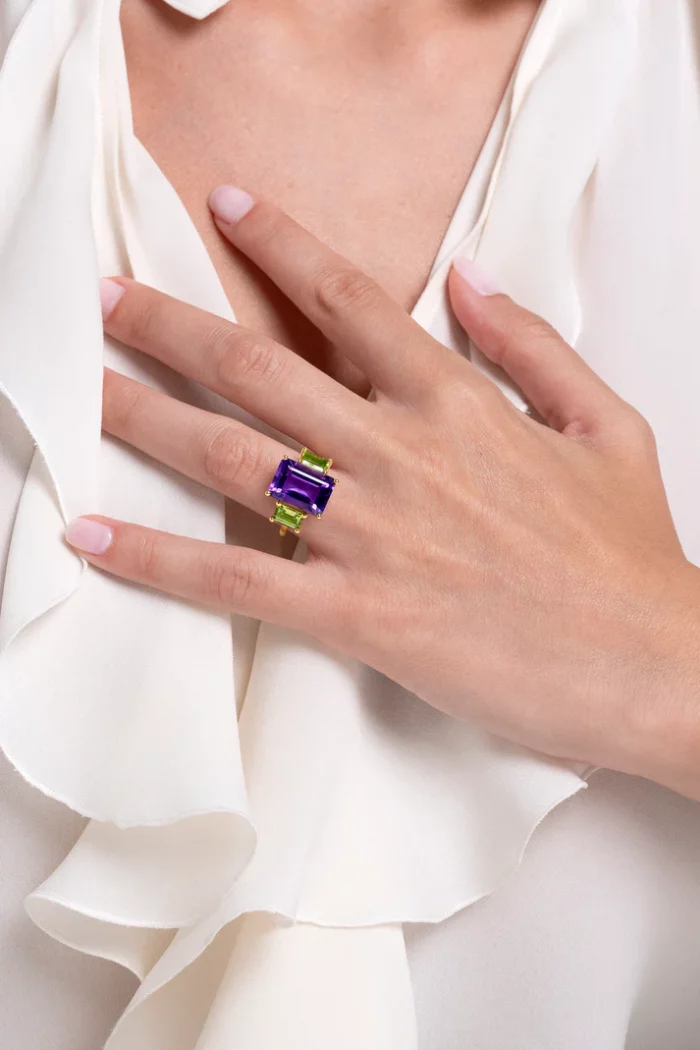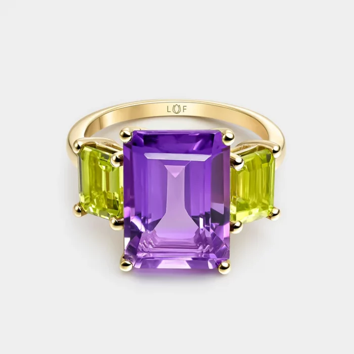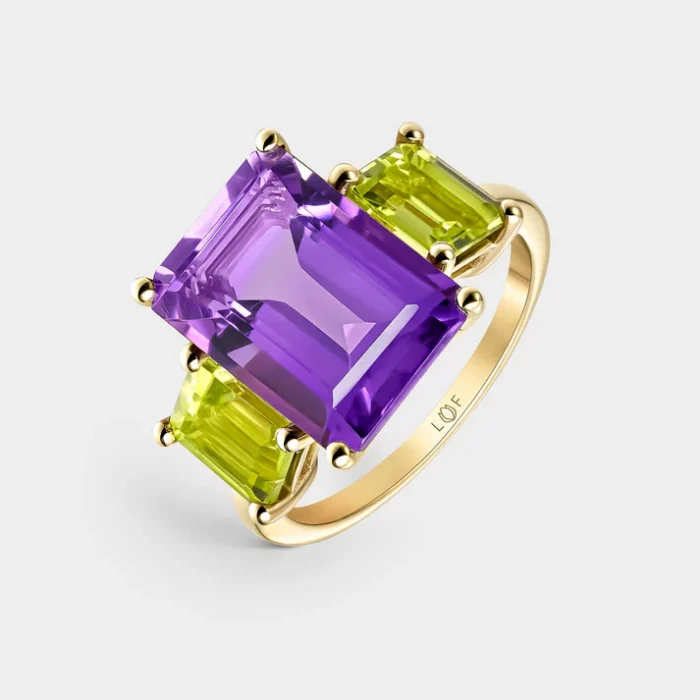 ANILLO DE ORO AMARILLO DE 18KTS CON 1 AMATISTA BRASIL OCTOGONAL DE 14X10MM Y 2 PERIDOTOS OCTOGONALES DE 7X5MM