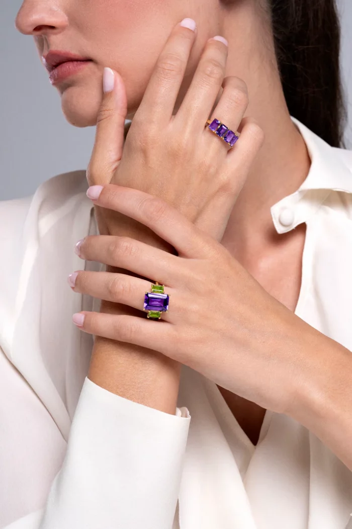 Sortija de oro amarillo 18 Ktes con Amatistas de Brasil y Peridotos.