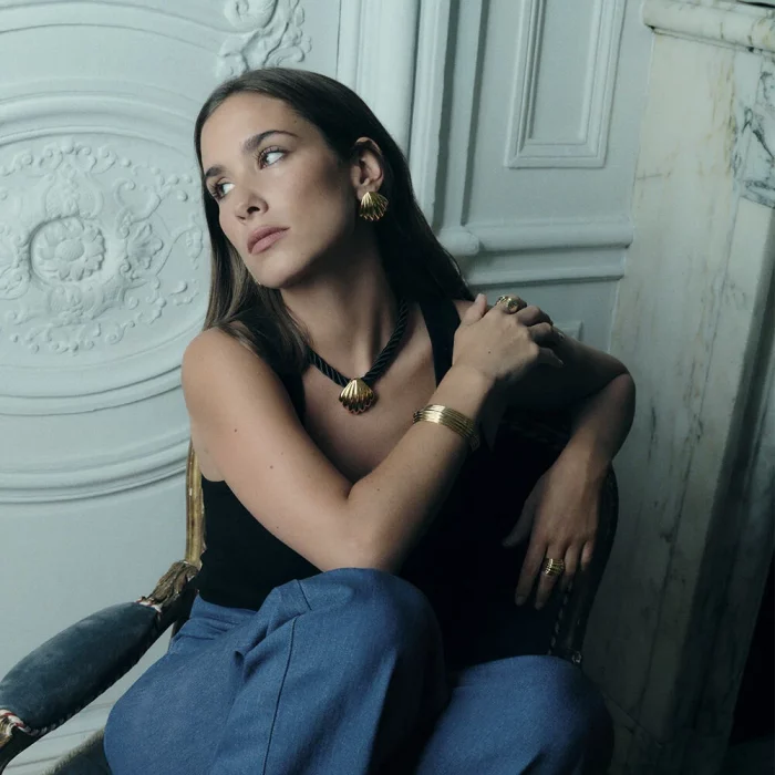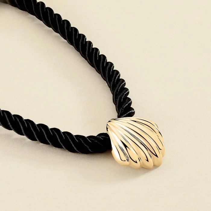 Collar corto de cordón XL de seda y colgante acabado en oro con forma de concha. Este tipo de collar es máxima tendencia y aportará un twist definitivo a cualquier outfit, tanto de diario como para una ocasión más especial. La colección nº13 de María Pombo está inspirada en las joyas vintage más icónicas de Agatha Paris y no puedes quedarte sin ellas.