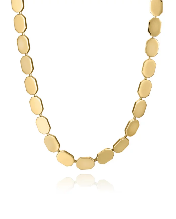 Collar de mujer en acero con acabado IP dorado, diseñado con una elegante fila de placas que aporta un toque moderno y sofisticado. Este diseño minimalista pero llamativo crea un equilibrio perfecto entre simplicidad y estilo, convirtiéndolo en el complemento ideal para cualquier ocasión. Su acabado dorado le confiere un brillo sutil y refinado, haciendo que este collar sea una pieza versátil y atemporal en el joyero de la mujer moderna. Perfecto para realzar tanto looks casuales como formales. Largo 40 + 5 cm.
