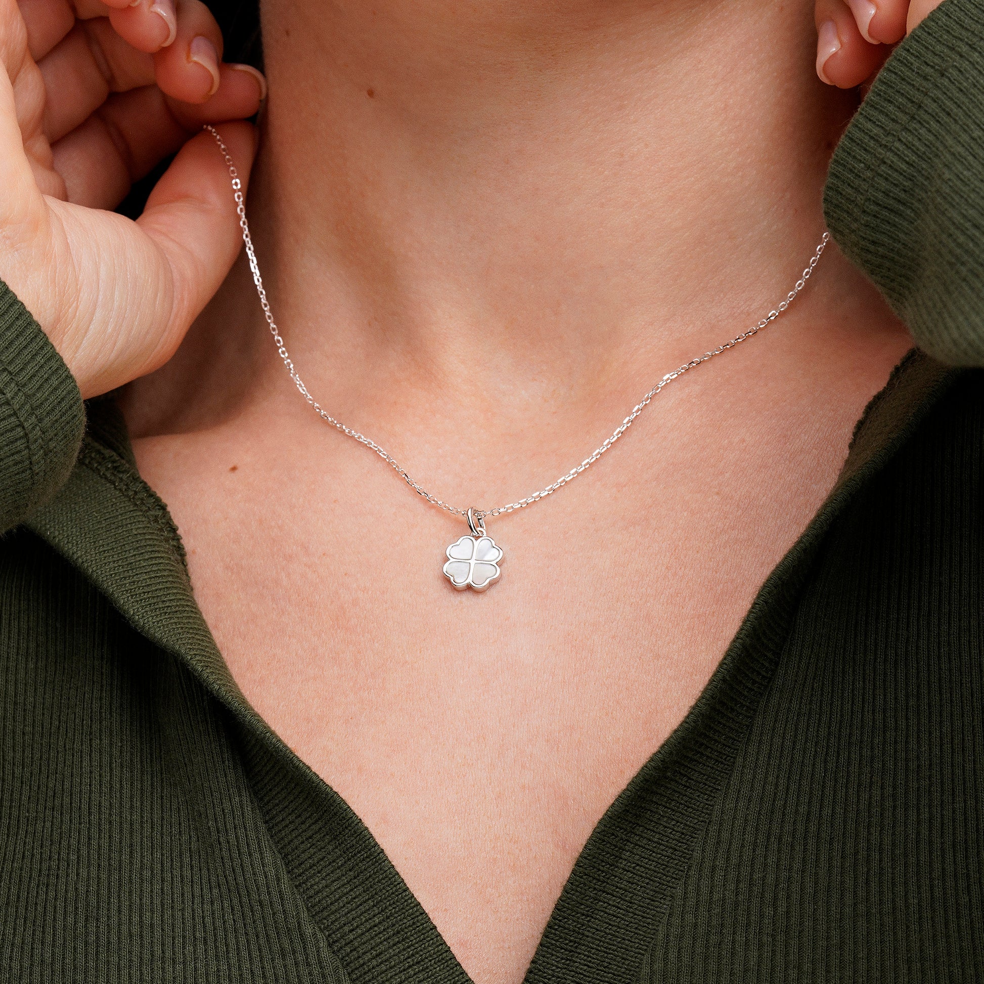 Este delicado collar presenta un trébol de madre perla, que simboliza buena suerte y prosperidad. Fabulosamente singular y elegante, perfecto para elevar cualquier atuendo con un toque de sofisticación.