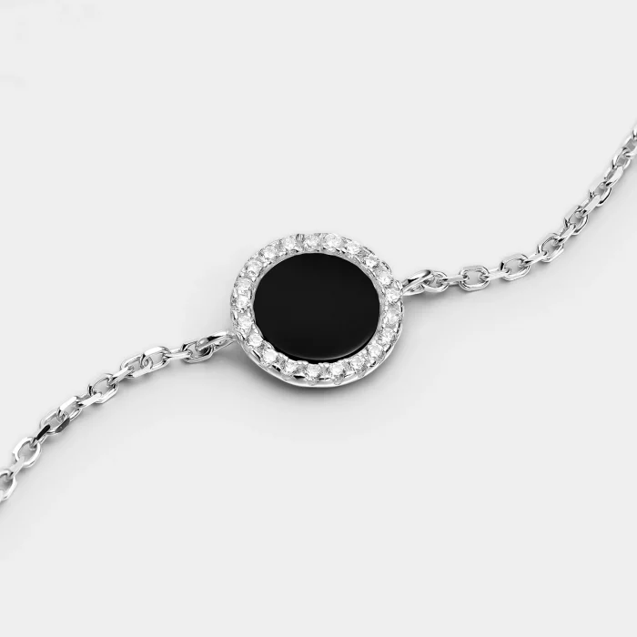 Esta pulsera de diseño exclusivo presenta un círculo grande de ónix rodeado de circonitas blancas, creando un contraste elegante y sofisticado. Hecha con materiales de alta calidad, esta pulsera es perfecta para añadir un toque de lujo a cualquier atuendo.