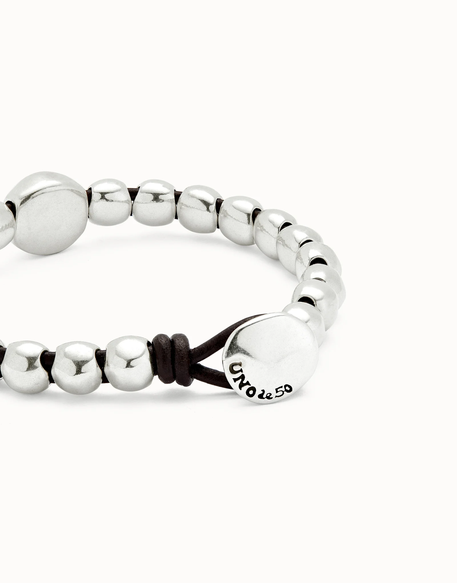 Pulsera de cuentas metálicas bañadas en plata con diseño elástico y cierre de botón de cuero. La protagonista es una burbuja central de mayor tamaño que marca el ritmo y aporta personalidad a una joya redonda, literal y simbólicamente.