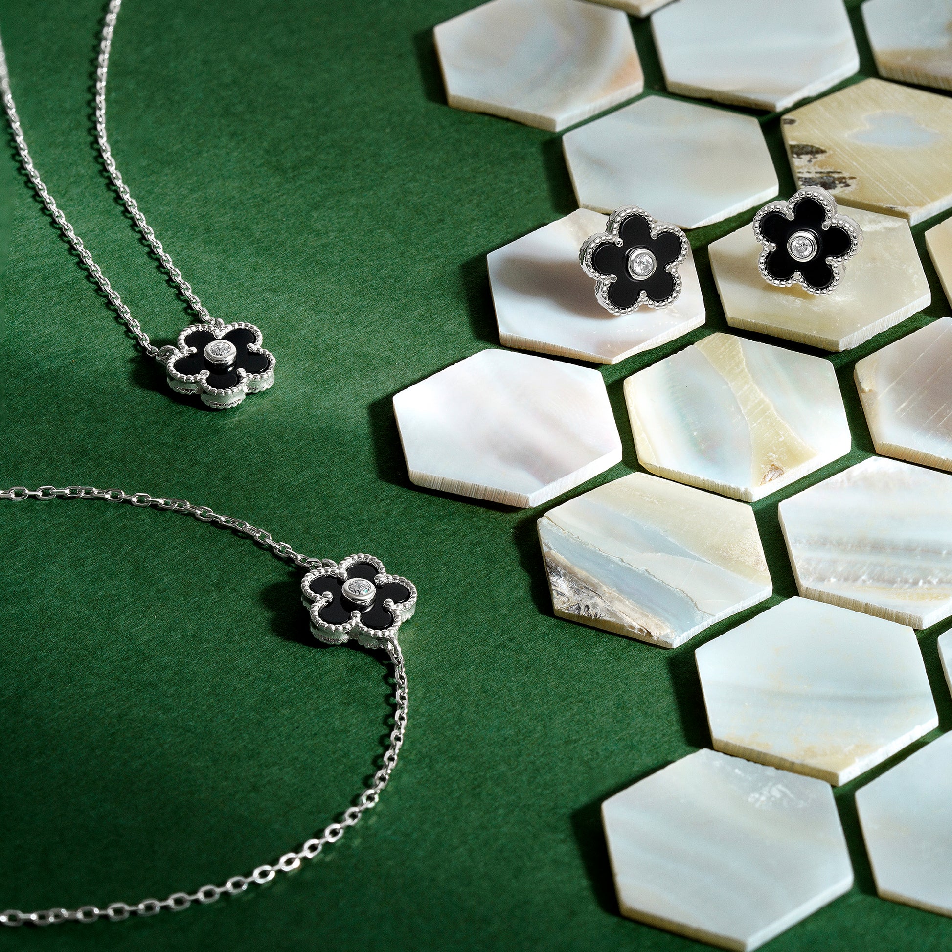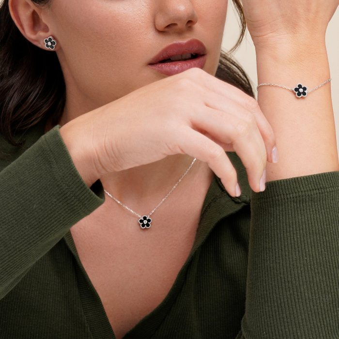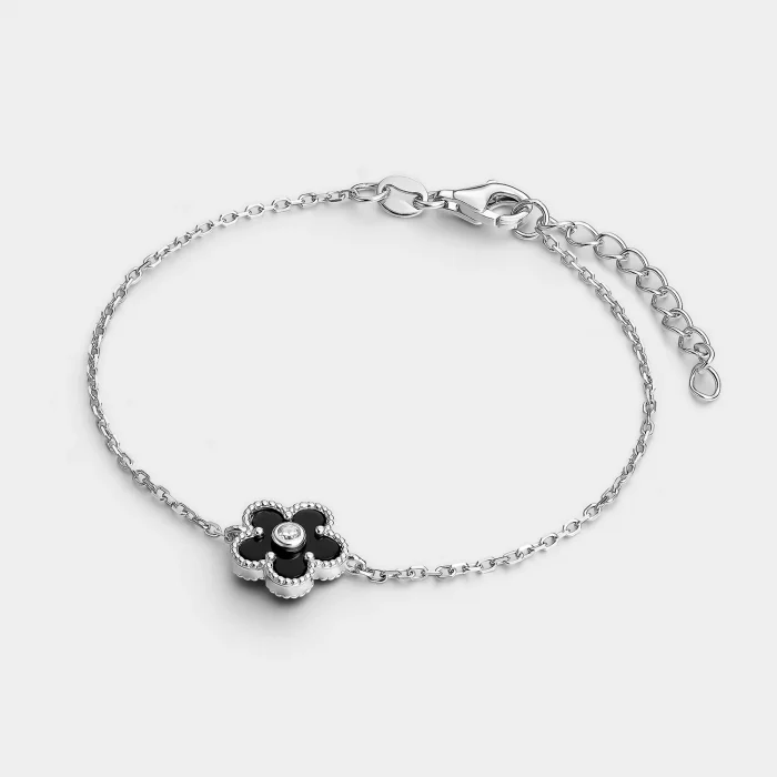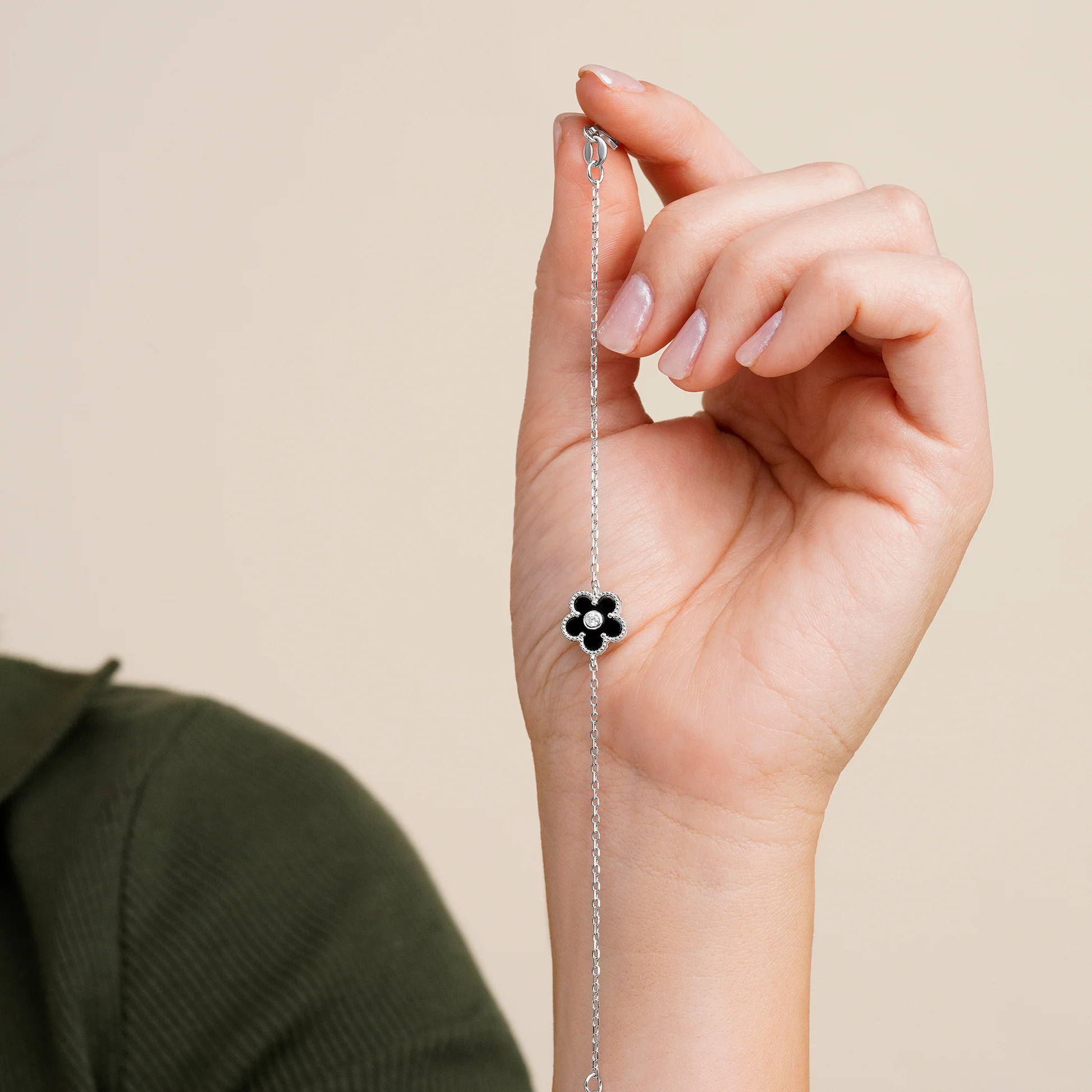 Eleva tu estilo con nuestra pulsera de ónix y circonita central en forma de una delicada flor. Hecha con los mejores materiales, esta pulsera no solo es elegante sino también lujosa. Anímate a darle un toque de sofisticación y exclusividad a tu look con esta pulsera única.