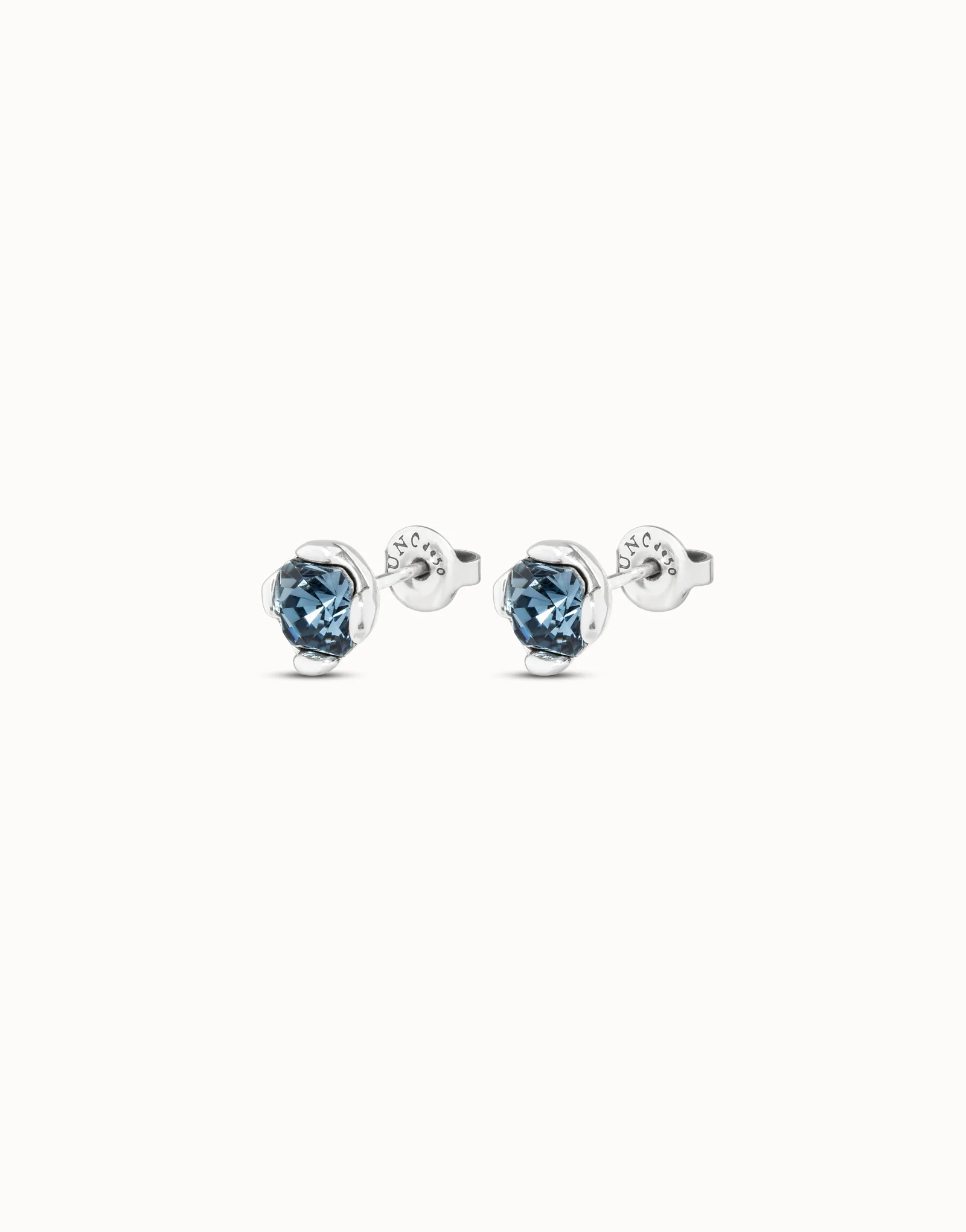 Pendientes bañados en plata de ley con un cristal facetado de color azul con cierre de tuerca con el logo de UNOde50 grabado. Una joya hecha a mano en España de manera artesanal.